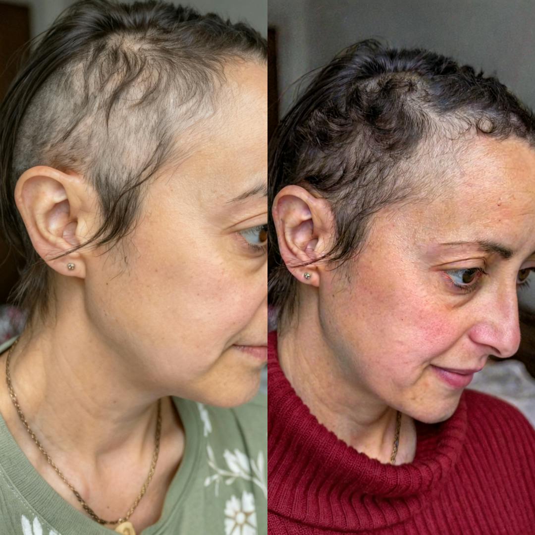 Quote: "I used to strategically style to hide my scalp. Now I wear any hairstyle I want - middle part, high pony, everything!"