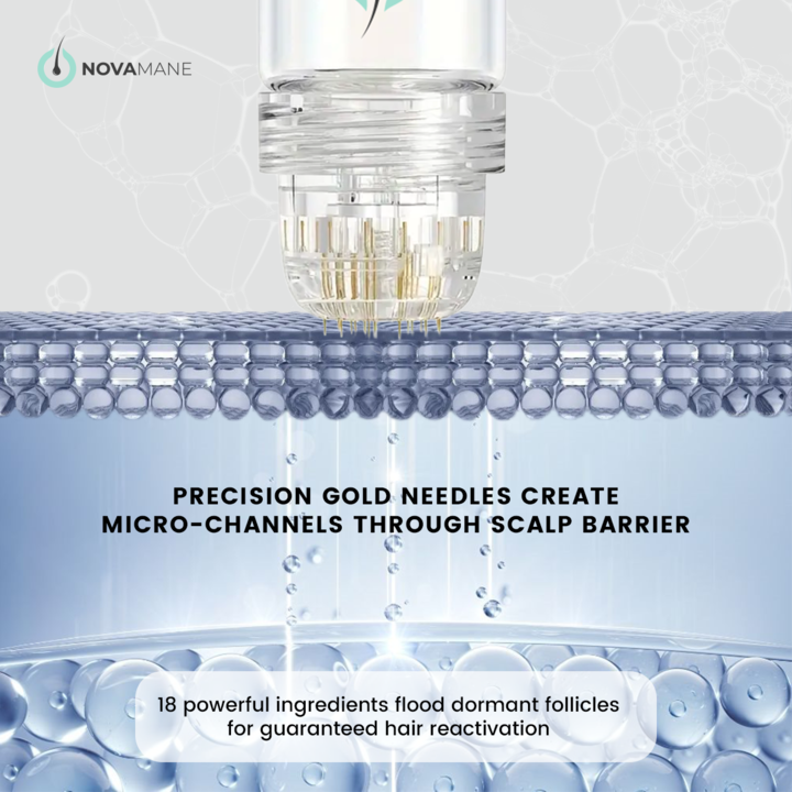 NovaMane combines micro-infusion technology with 18 clinically-studied ingredients. The needles create temporary micro-channels that deliver our serum directly to dormant follicles, bypassing the skin's barriers. This triggers natural healing responses, increases blood flow, and reactivates hair growth - all without drugs or chemicals.