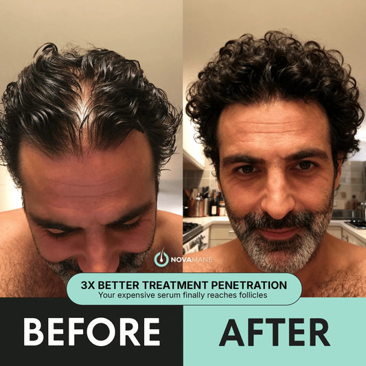 Always been insecure of my receding hairline but didn't want to use fin/min since I've heard horror stories about it . Used NovaMane for 6 weeks and my crown is already thicker than ever before. Life changing bro.
